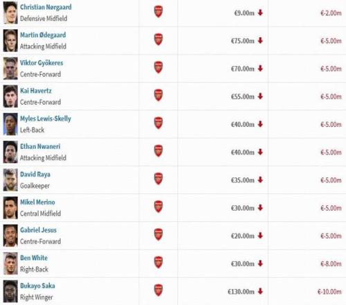 阿森纳身价变动(单位:欧元)