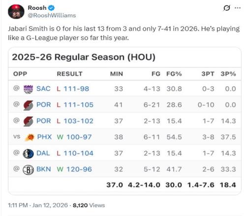 进入2026年后火箭队的6场比赛,小贾合计83中25,三分球41中7,命中率30%,三分命中率18.4%,这个表现真的尴尬到极点,要知道他是一位身高2.11米,臂展2.2米的大前锋啊!他NCAA的球探报告就是能投三分、能护框、兼具运动能力的空间型四号位,结果就这?