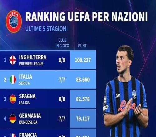 各联赛欧战积分排名:英超居首,意甲&西甲&德甲分列二到四位